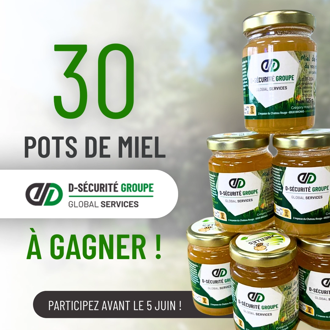 Nous sommes ravis de vous offrir l’opportunité de remporter l’un des 30 pots de miel D-Sécurité Groupe, issus de nos ruches installées sur site pour soutenir la biodiversité.